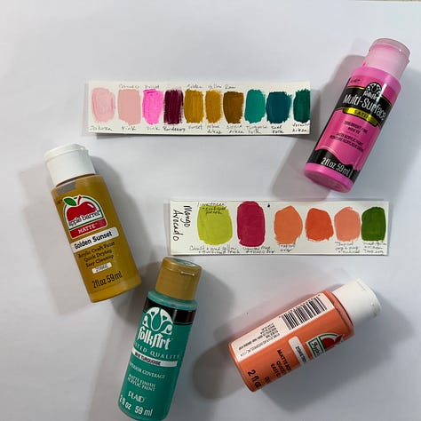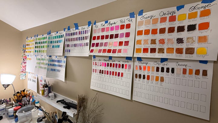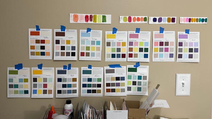 I hang the paint card palettes and Pinterest color swatch palettes on the wall in my studio because that removes any friction of selecting a palette. I can let my mood or curiosity lead. And I make sample color swatch cards for each of the paints I buy, both acrylic and watercolor, and for the other media. I make these swatch cards while watching hockey and find them very therapeutic. They save me time (and energy) matching media to color palettes in the future.