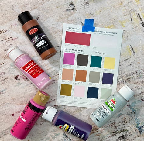 For acrylics, I buy paint that roughly matches the colors on the palette. I do very little color mixing for acrylic paint. They dry too fast and, especially if I am Gelli printing, I want to grab the color without having to mix it first.