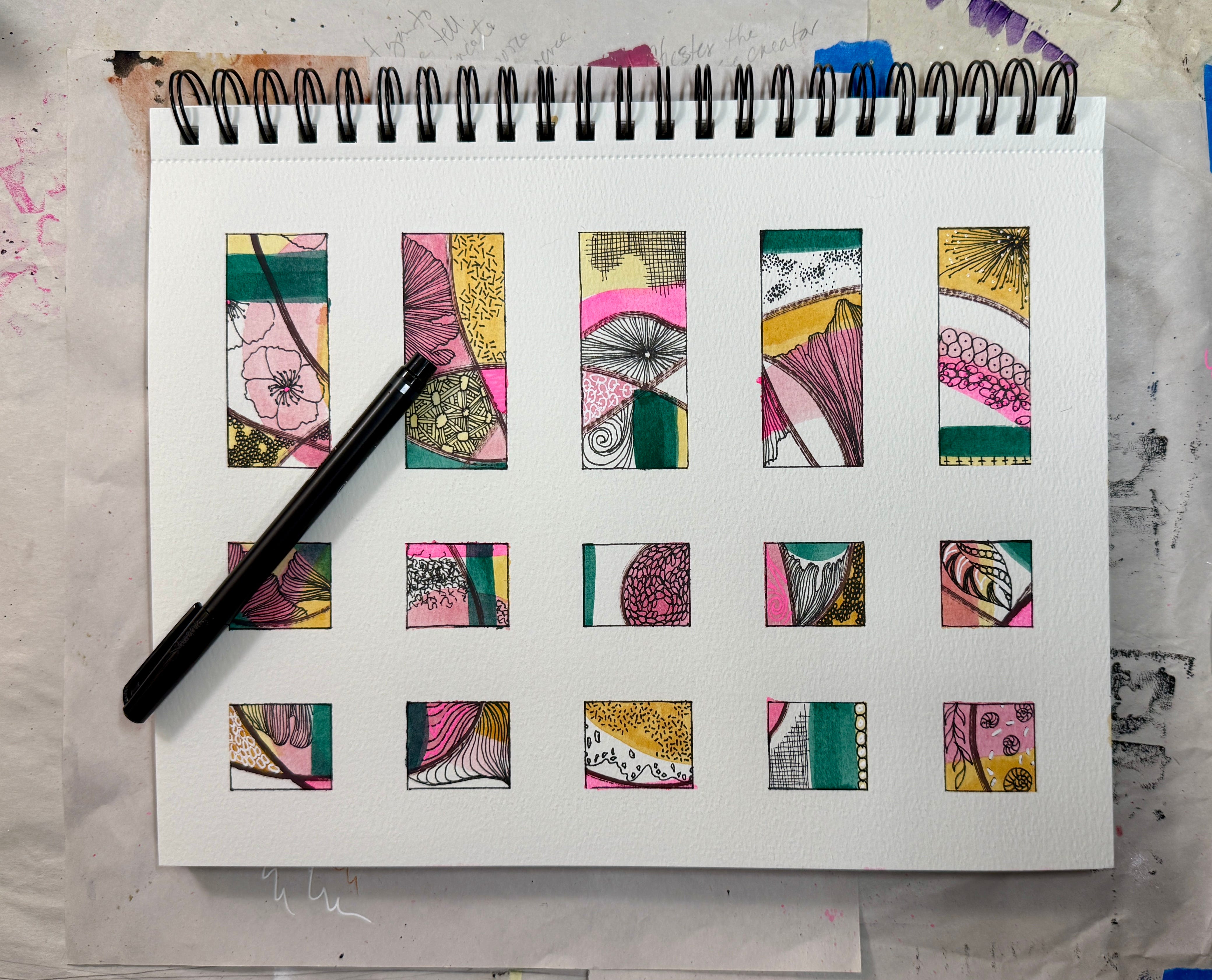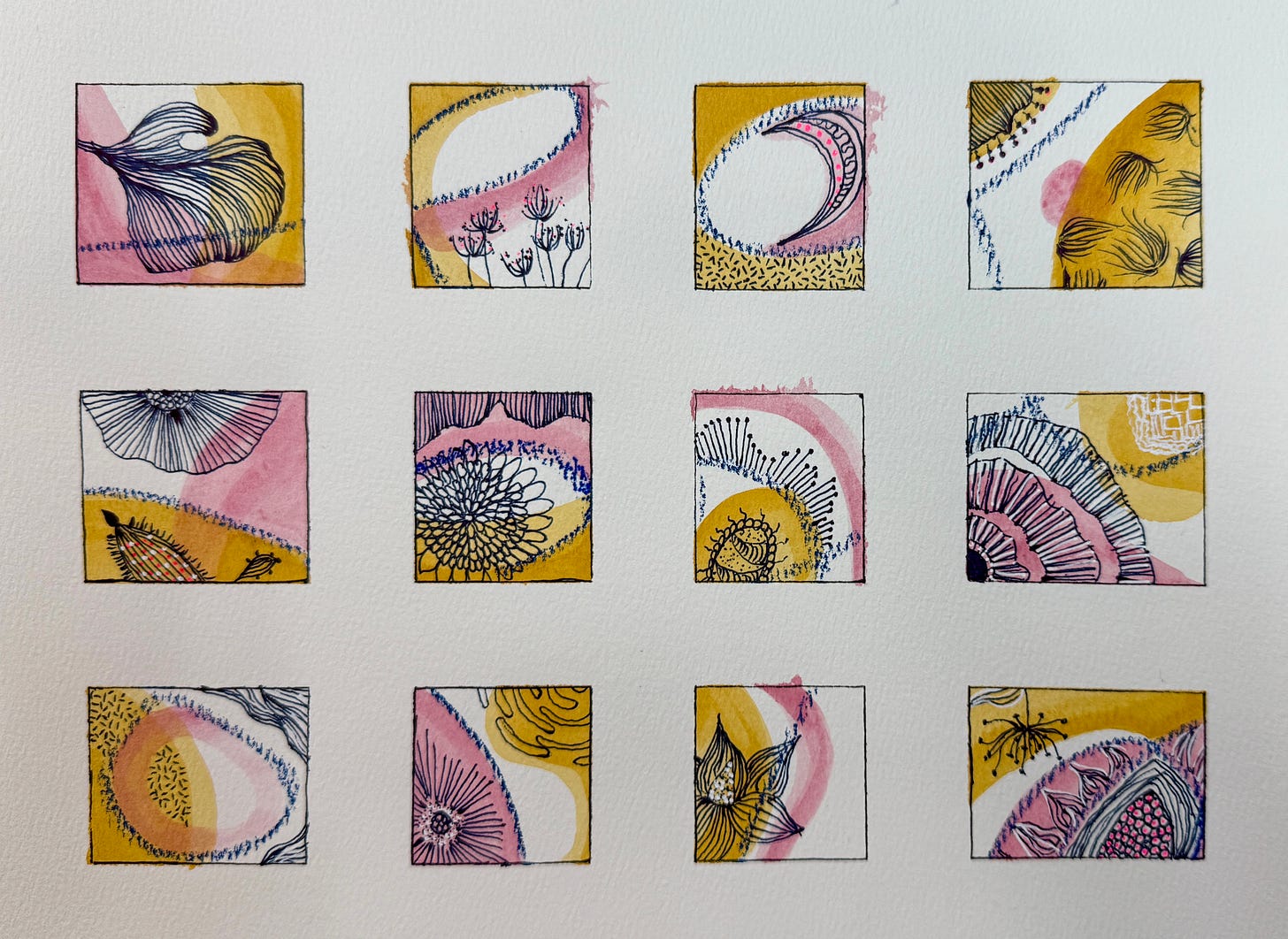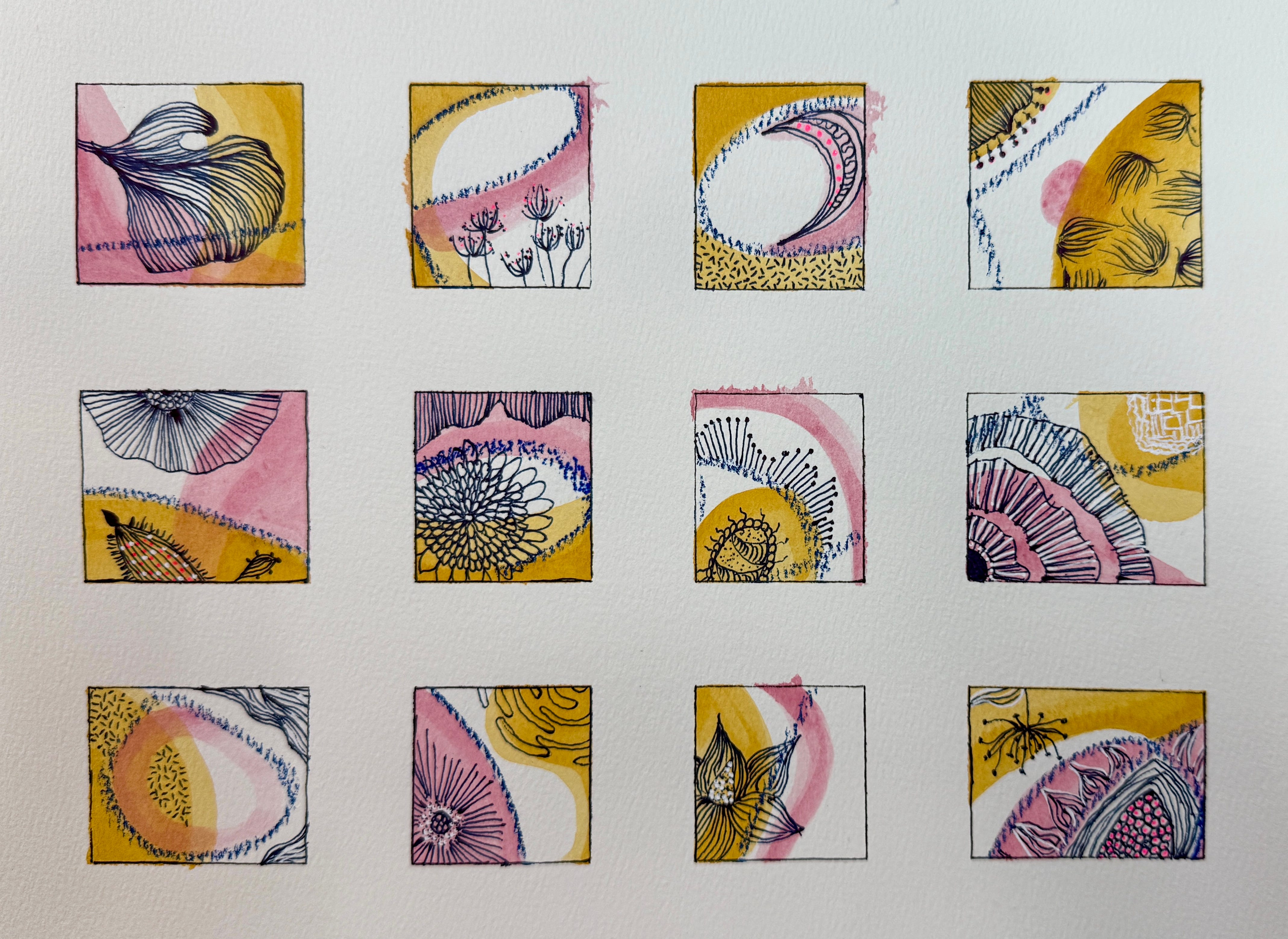 I’ve been making these for years—a grid of small rectangles, three colors, three different media: watercolor, mark making, slow drawing. The result is something I can’t stop looking at.