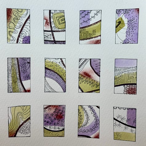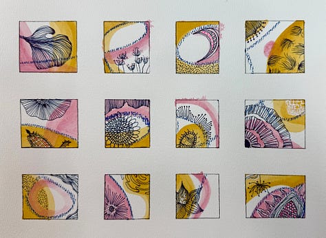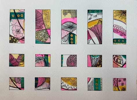 Abstract Watercolor Windows is a five-week mixed media practice that layers three things you may have already tried separately into one small, contained piece of art: mark making, watercolor washes, and slow drawing.